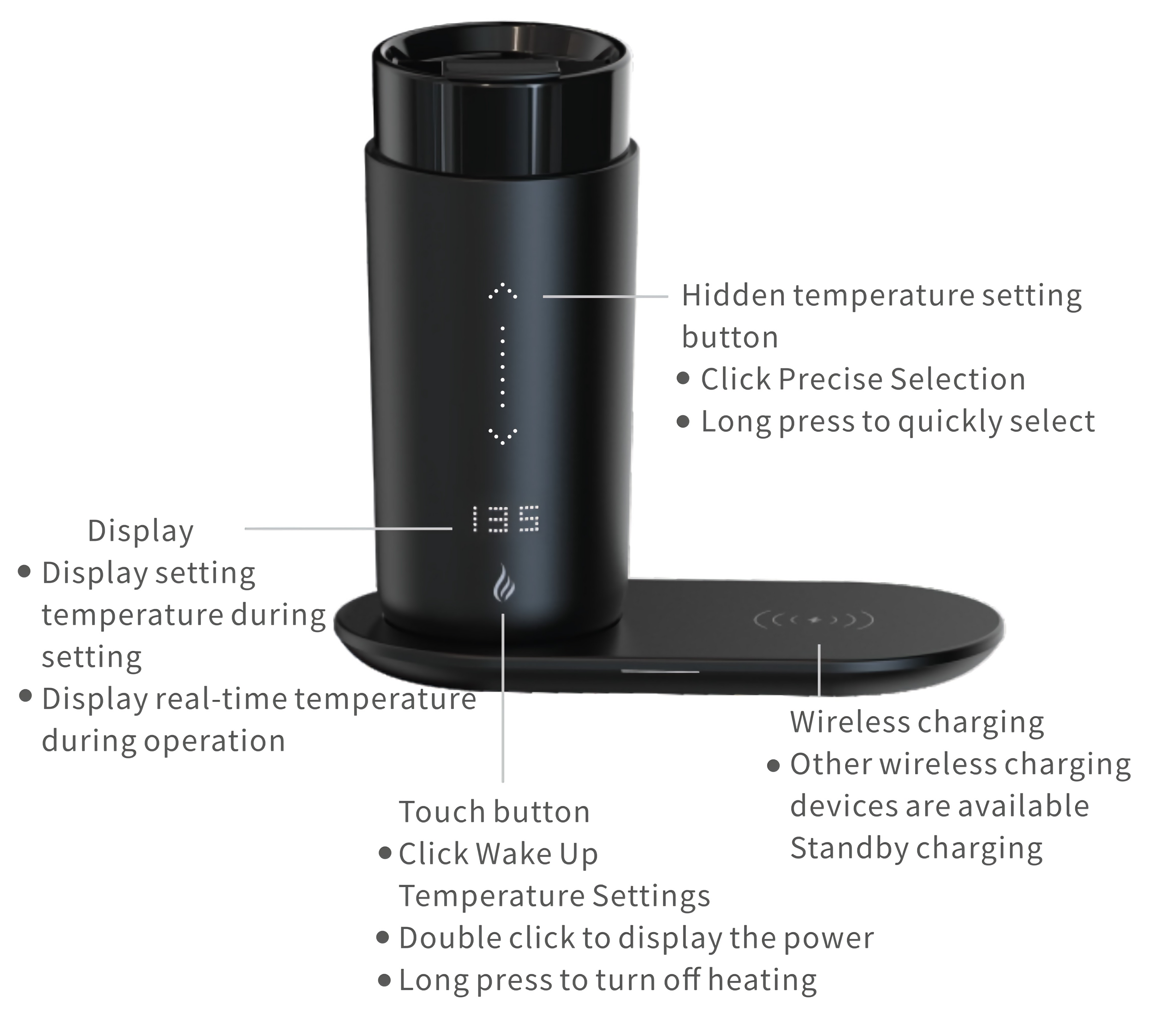 - Click the flame button on the bottom of the mug to wake up